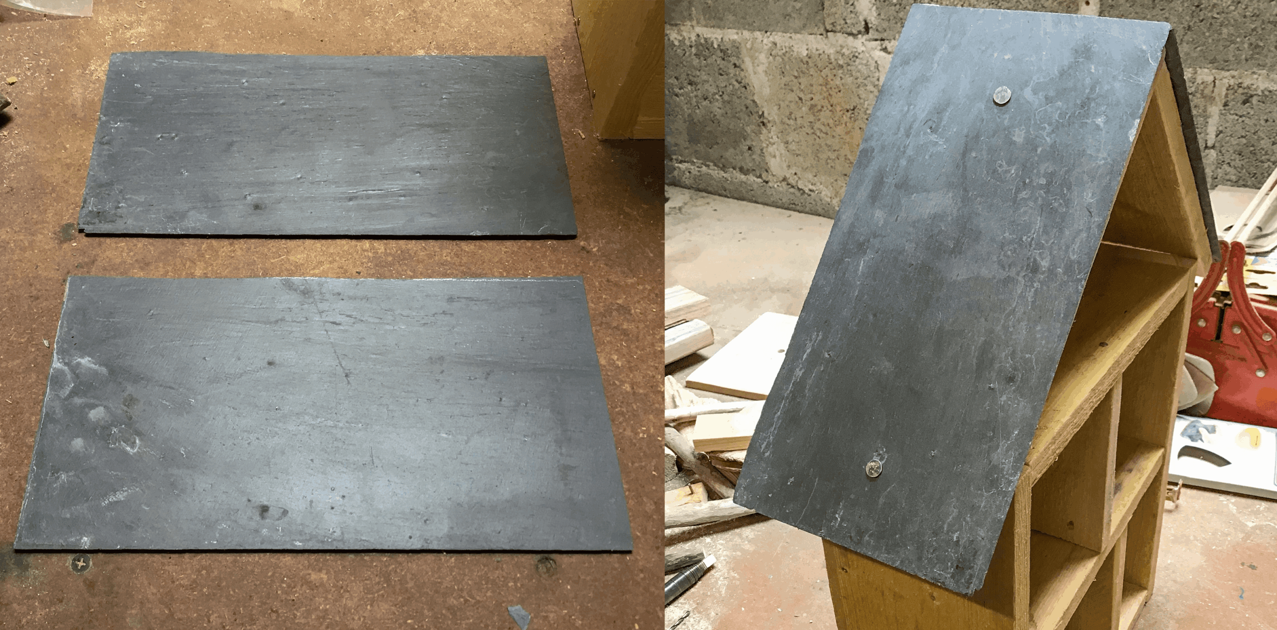 Maintenant découpez les deux ardoises de 27 x 14 cm à l’aide d’une scie sauteuse et d’une lame métal. Percez deux trous dans chaque ardoise avec la perceuse puis les clouer sur les deux planches du toit avec les quatre pointes spéciales ardoise.