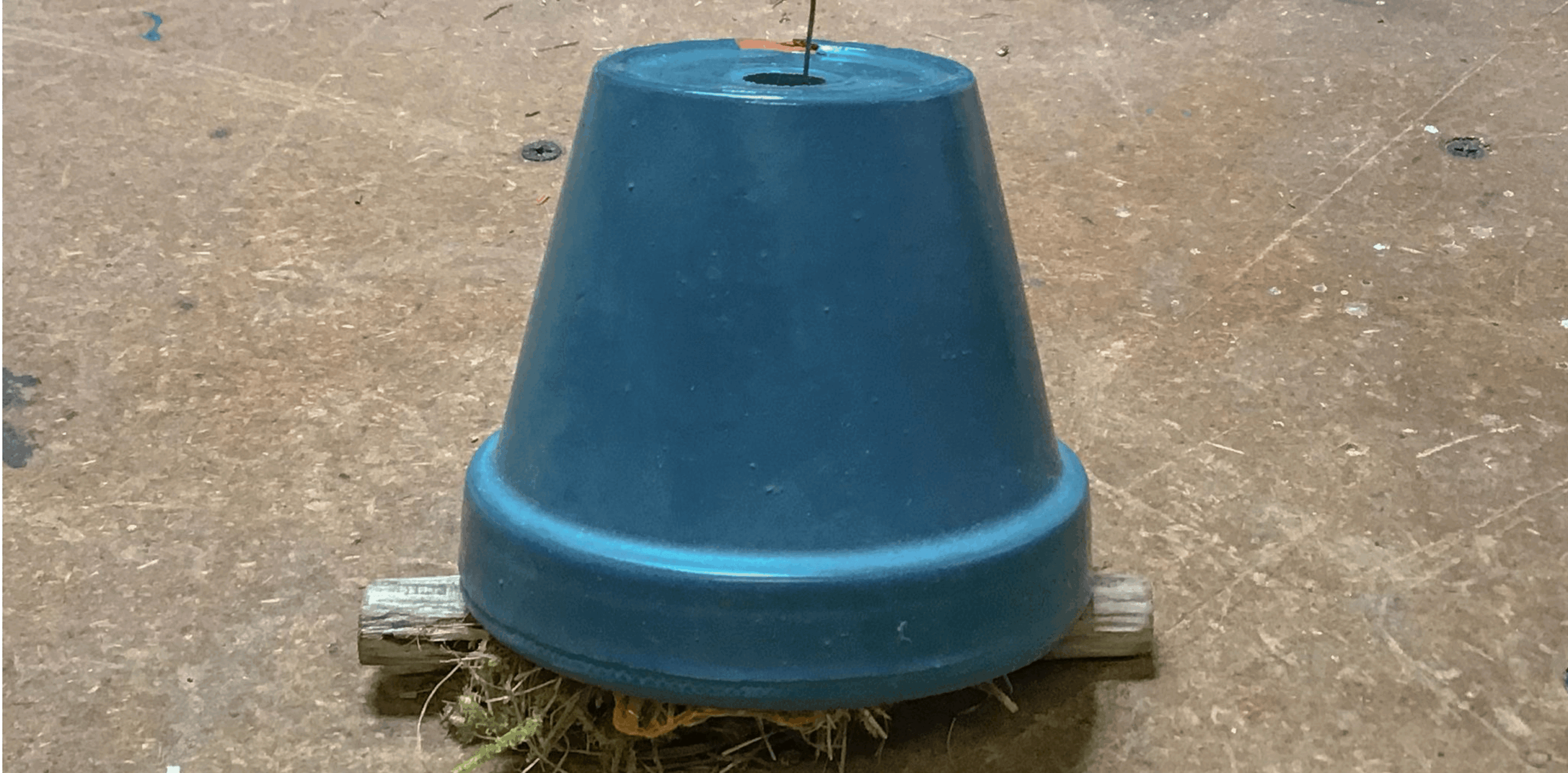 Tout d’abord, il faut préparer le pot en terre en le remplissant de foin dans le filet, y passer un fil de fer souple que vous enroulerez sur un bois. Le fil de fer passera ensuite dans le foin pour ressortir par le trou du pot.