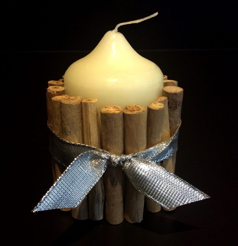 Grosse Bougie couleur blanc cassé entourée de petits morceaux de Bois flottés tenus par un fil de lin et entouré d’un Ruban couleur argent que l’on peut enlever après les fêtes de Noël.