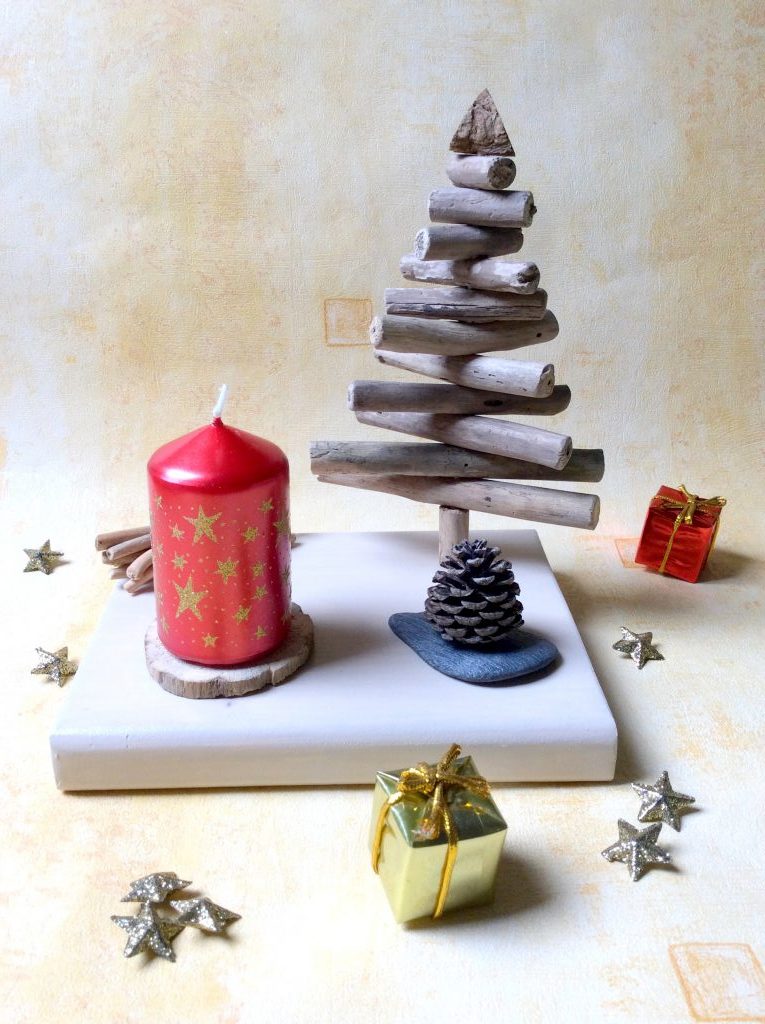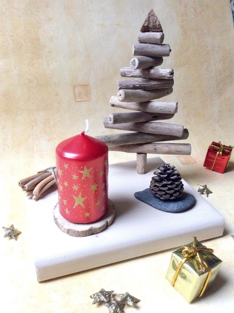 Bougeoir en Bois flotté avec une grosse Bougie rouge et éToiles dorées posée sur un disque en Bois flotté, agrémenté d’une Pomme de pin sur un Galet et d’un petit fagot en Bois flotté, le tout fixé sur un socle en Bois peint couleur crème.