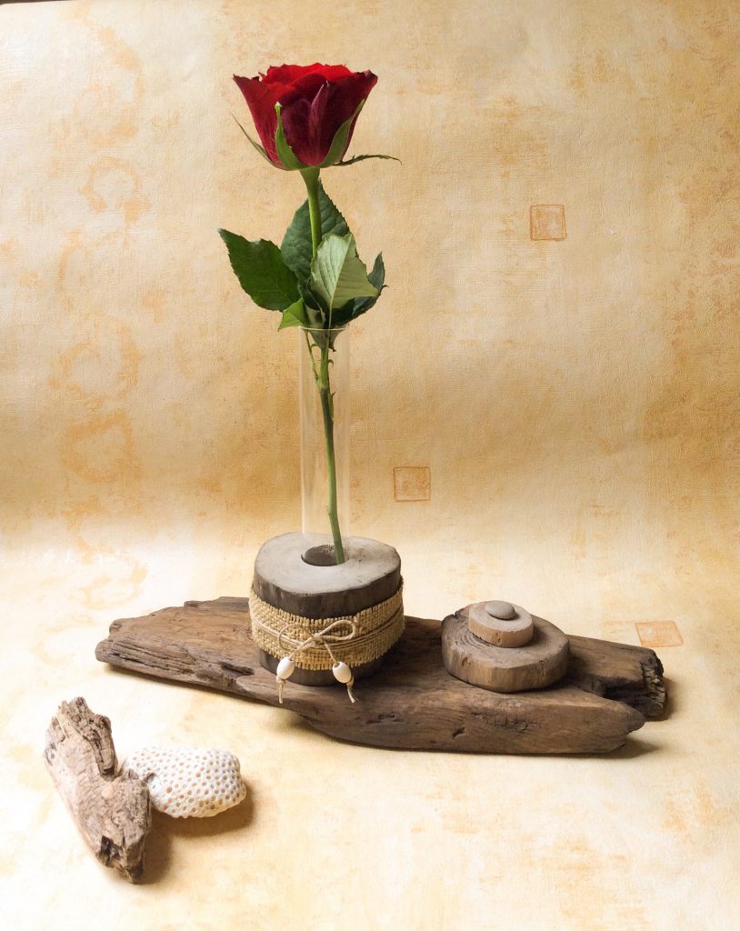 Soliflore en Verre, encastré dans un support en Bois flotté, à poser sur un meuble ou autre.