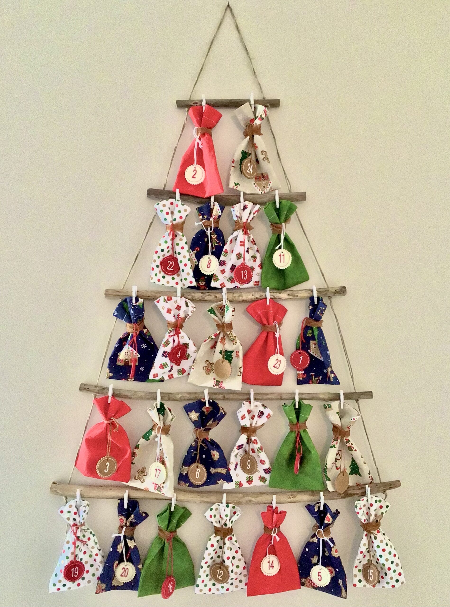 Calendrier de l’Avent en bois flotté et ses 24 petits sachets en tissu de coton multicolore, à remplir selon votre choix (chocolat, figurines, etc.).
