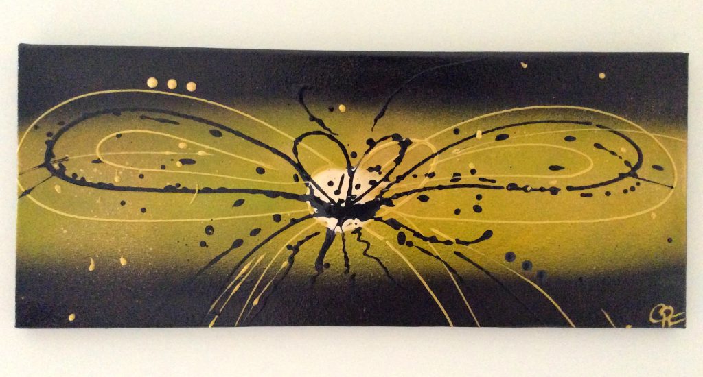 Tableau de style Abstrait et de forme rectangulaire dans les couleurs noir et moutarde avec du relief et des touches d’or.