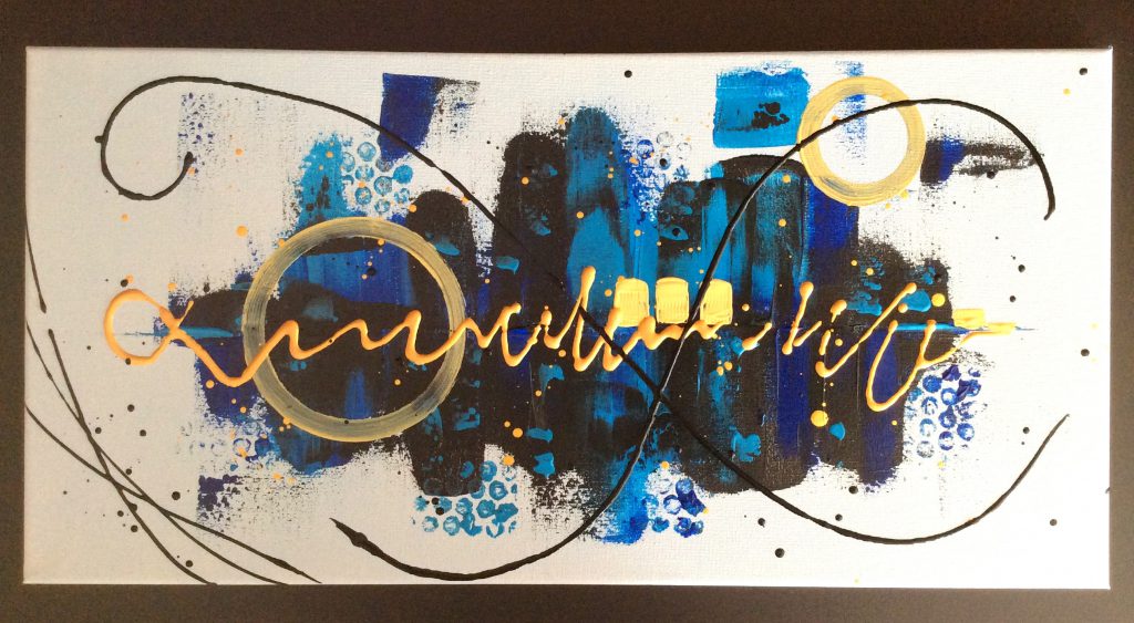 Tableau de style Abstrait dans les couleurs noir, bleu et blanc, avec des touches de doré, peint à l’acrylique.