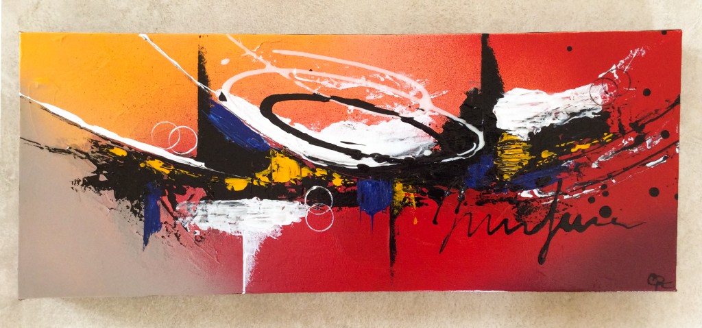 Tableau de style Abstrait, de forme rectangulaire en 3D dans les couleurs rouge, Orange, taupe, noir et blanc et une touche de bleu avec un peu de relief.
