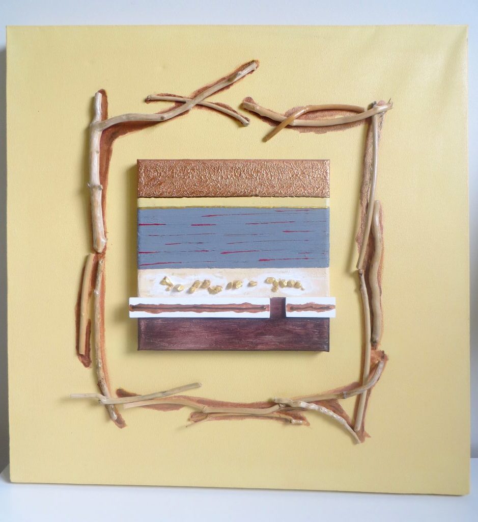 Tableau abstrait dans les tons jaunes avec du bois flotté