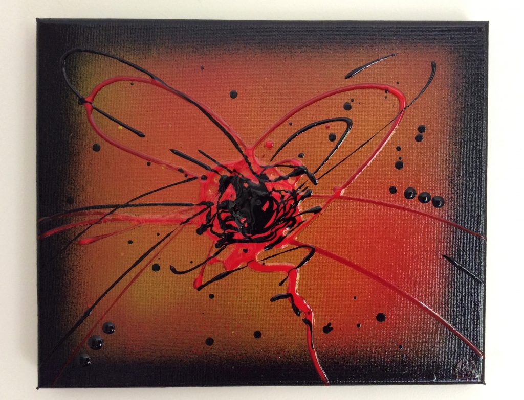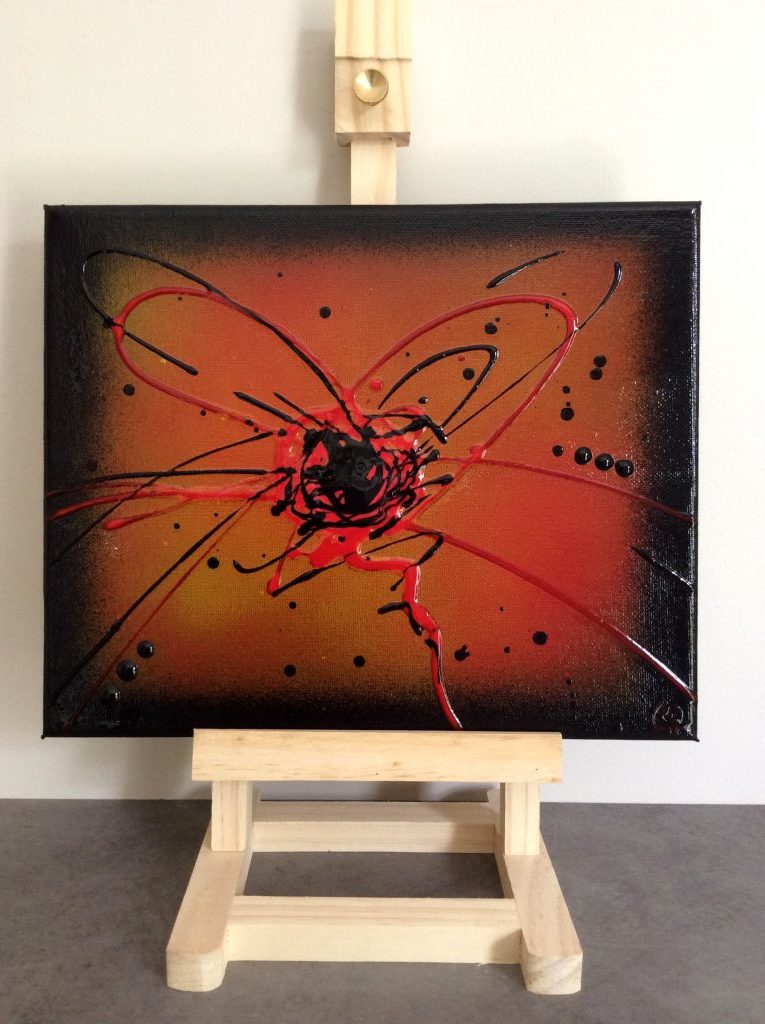 Tableau de style Abstrait dans les couleurs rouge, Orange et noir, peint à l’acrylique avec une partie en relief.