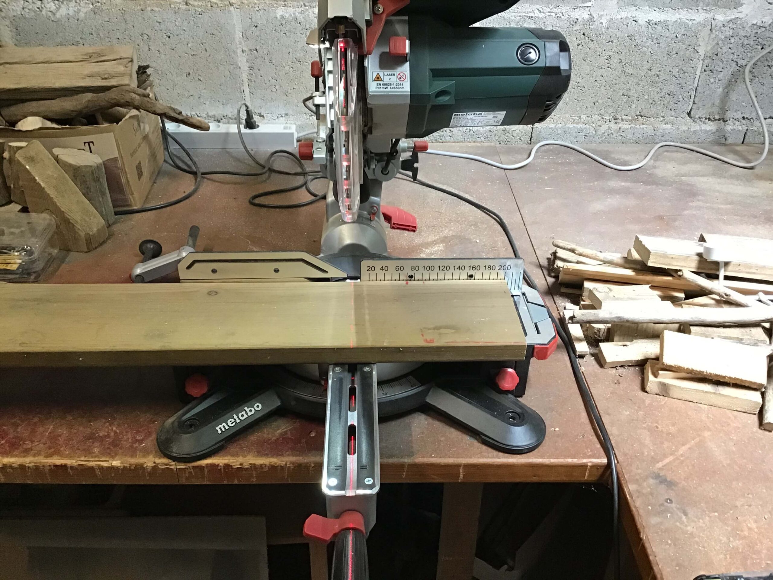 - Coupez un socle en bois de 20 x 14 cm ainsi que l’une des extrémités de chaque bois, avec une scie.